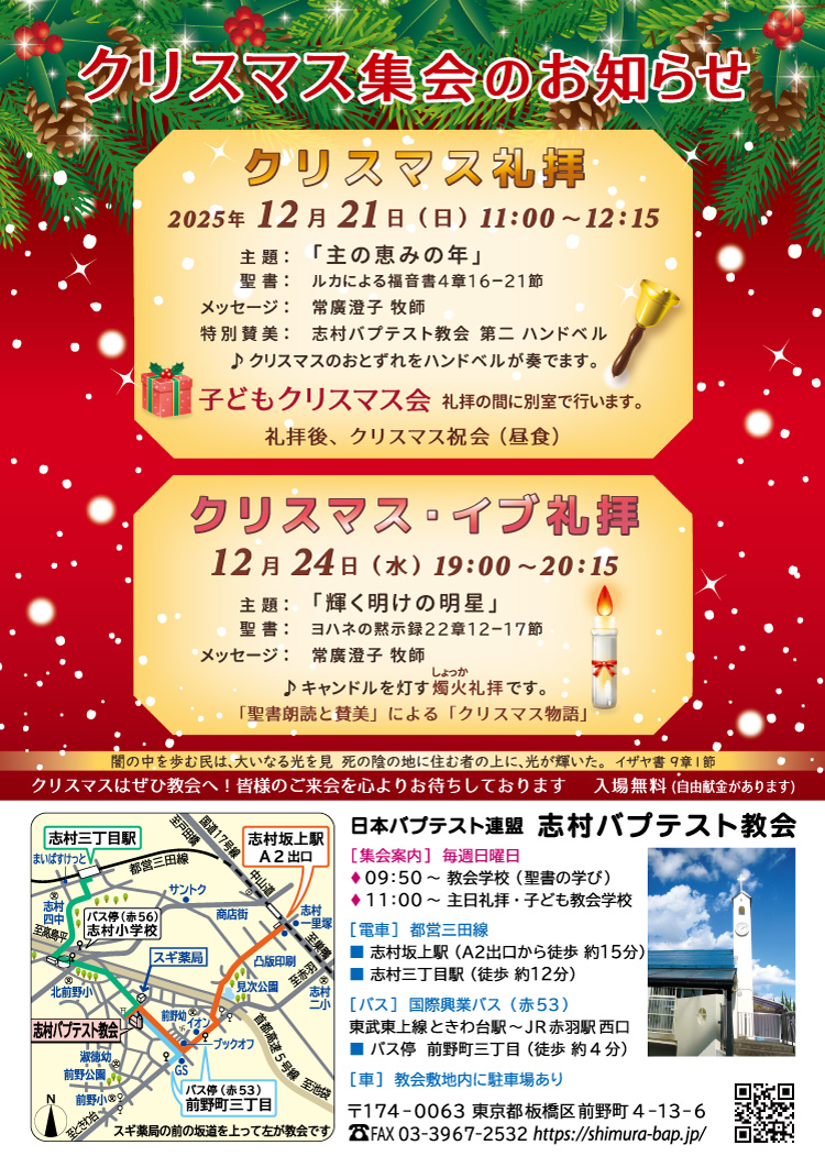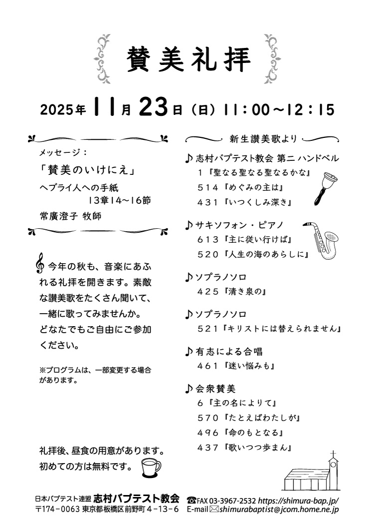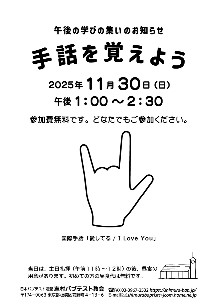 | ・2025年11月16日(日)子ども祝福 ・2025年11月23日(日)昼食あり 11:00~12:15 賛美礼拝 ちらし.jpg ・2025年11月30日(日)昼食あり 13:00~14:30 午後の学びの集い「手話を覚えよう」 ちらし.jpg |